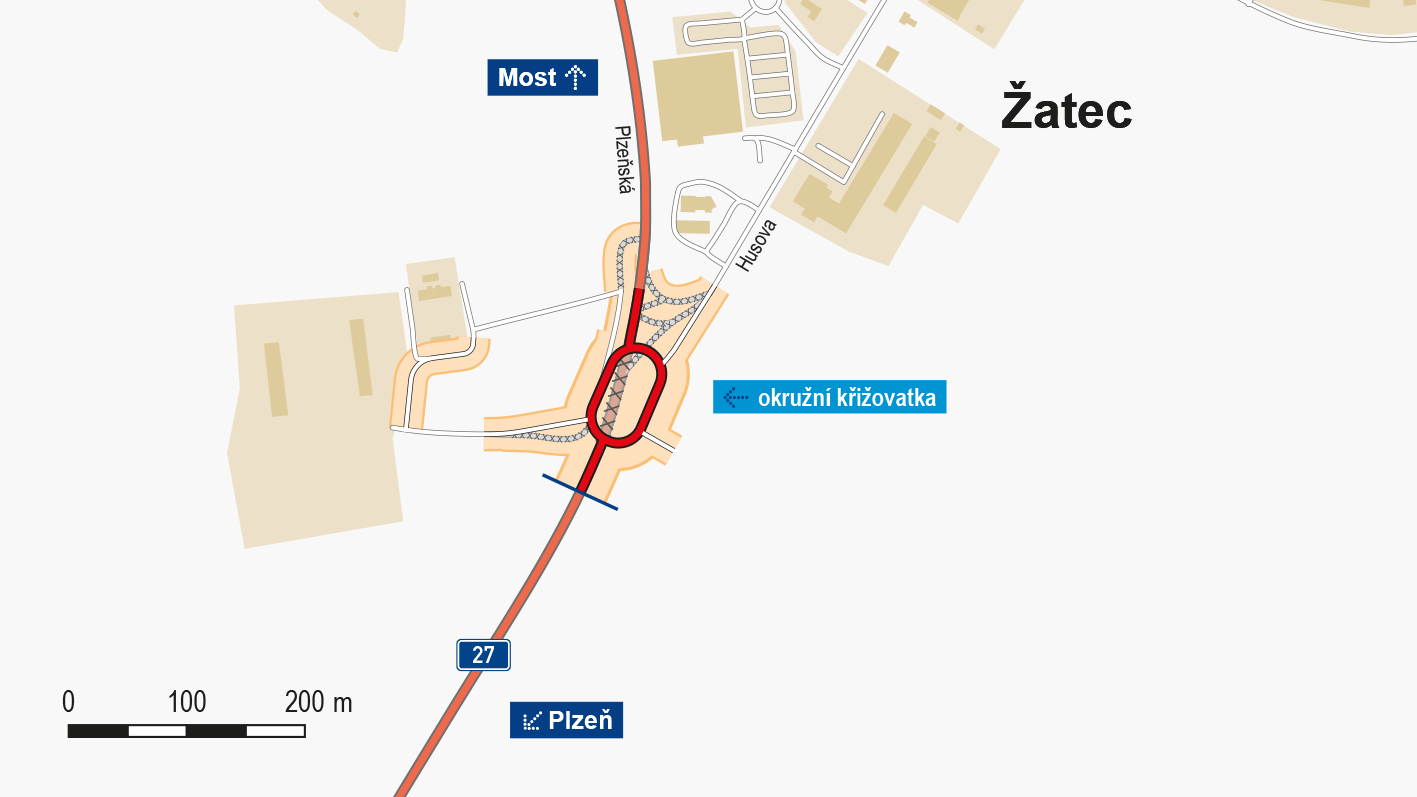 Cílem záměru je přestavbu stávající stykové křižovatky silnice I/27 s ulicí Husova na okružní křižovatku (OK) se zapojením rozvojových zón v souladu s územním plánem Města Žatec. Křižovatka leží na hlavní trase nadměrných nákladů. Jejich jízda je uvažována po východní části OK. Vzhledem k poloměrům a šířce jízdního pásu a prstence není potřeba provádět žádné stavební úpravy pro průjezd.